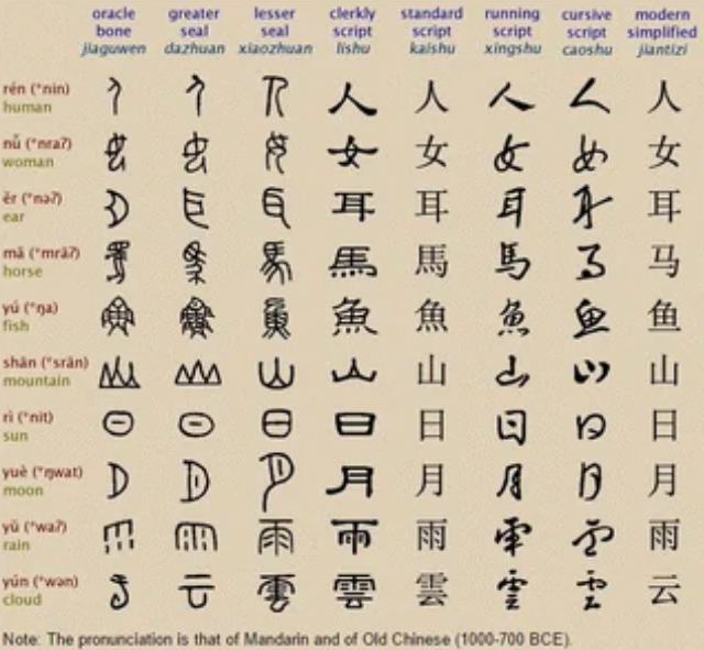 خط چینی منحصر به فردترین سیستم نوشتاری در جهان است. این خط در قرن چهاردهم کاملاً پیشرفته بود. حروف چینی، از نقاشیها و علائم رسمی سرچشمه گرفتهاند. تعیین زمان دقیق ظهور حروف چینی دشوار است. قدیمیترین حروفی که امروزه میبینیم، خطوط روی لاک لاکپشت و استخوان حیوانات سلسلۀ شانگ (قرن ۱۷ تا ۱۱ پیش از میلاد) و خطوط حک شده بر روی ظروف برنزی هستند. حروف سلسلۀ شانگ بسیار توسعه یافته بودند؛ بنابراین حروف چینی ممکن است مدتها پیش از این سلسله، شاید در اوایل عصر حجر جدید، یعنی حدود ۴۰۰۰ تا ۵۰۰۰ سال پیش، پدید آمده باشند.
